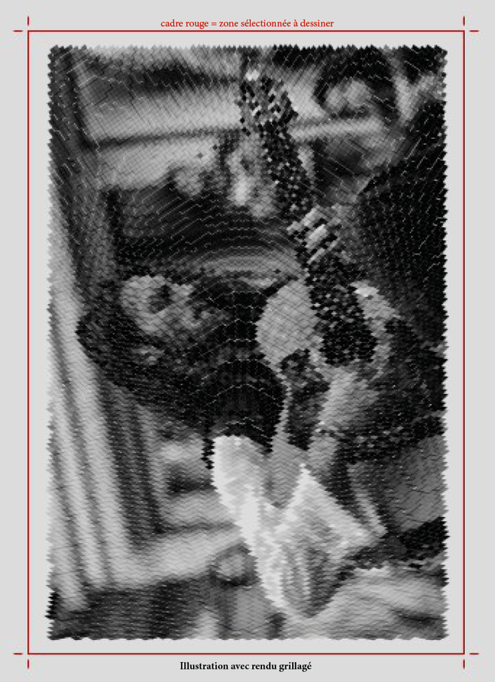 1°) Cliquez sur "sélection zone" et cliquez-glissez dans la zone de travail pour sélectionner la zone à dessiner. 2°) Cliquer ensuite sur "définir cadre sur zone" pour prendre en compte la zone à dessiner. 3°) Enfin, cliquez sur "sélectionner cadre" pour confirmer la zone à dessiner. |